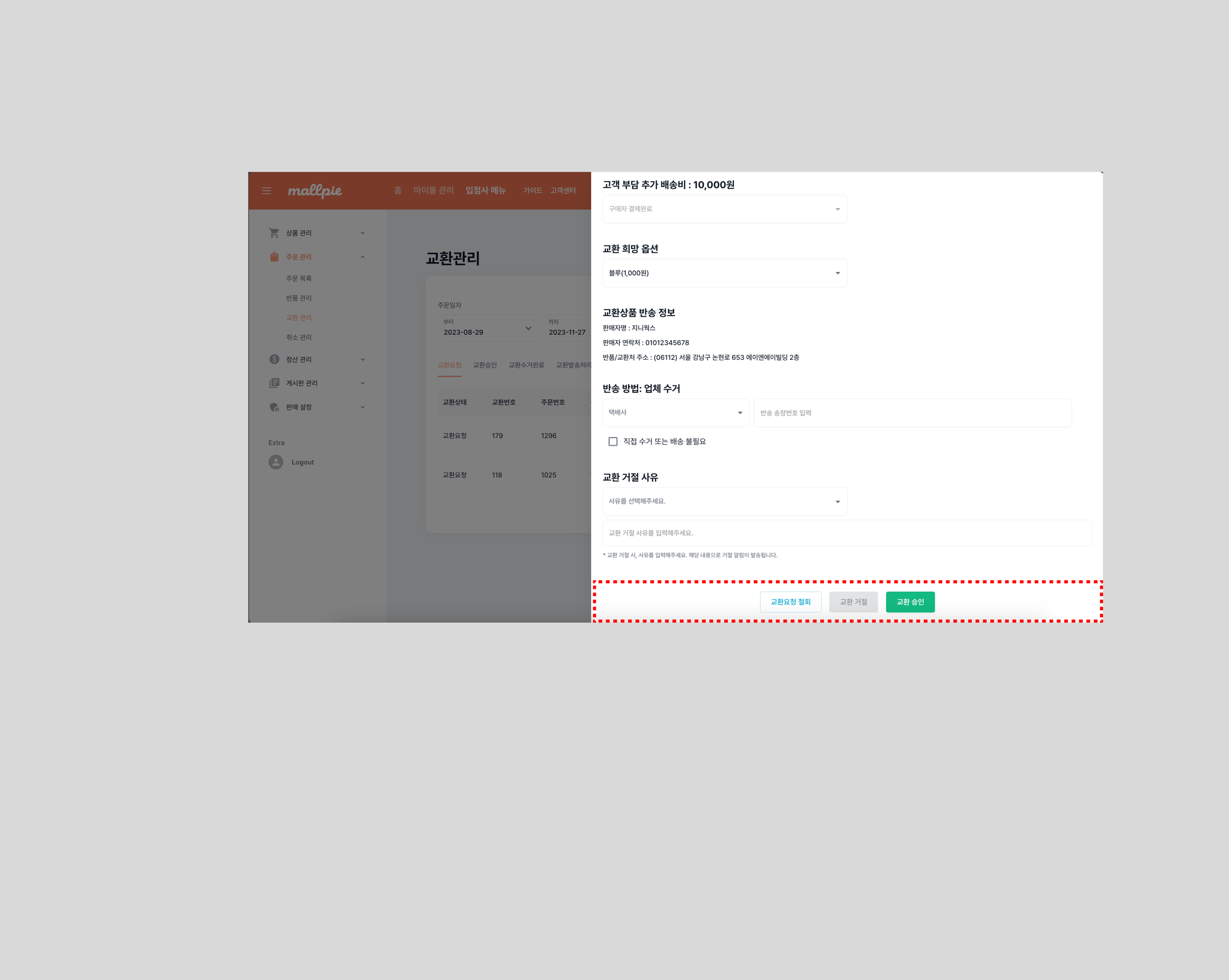 교환 승인된 주문 건은 교환 상품에 대한 수거 작업 완료 후 다음 단계로 진행할 수 있습니다.